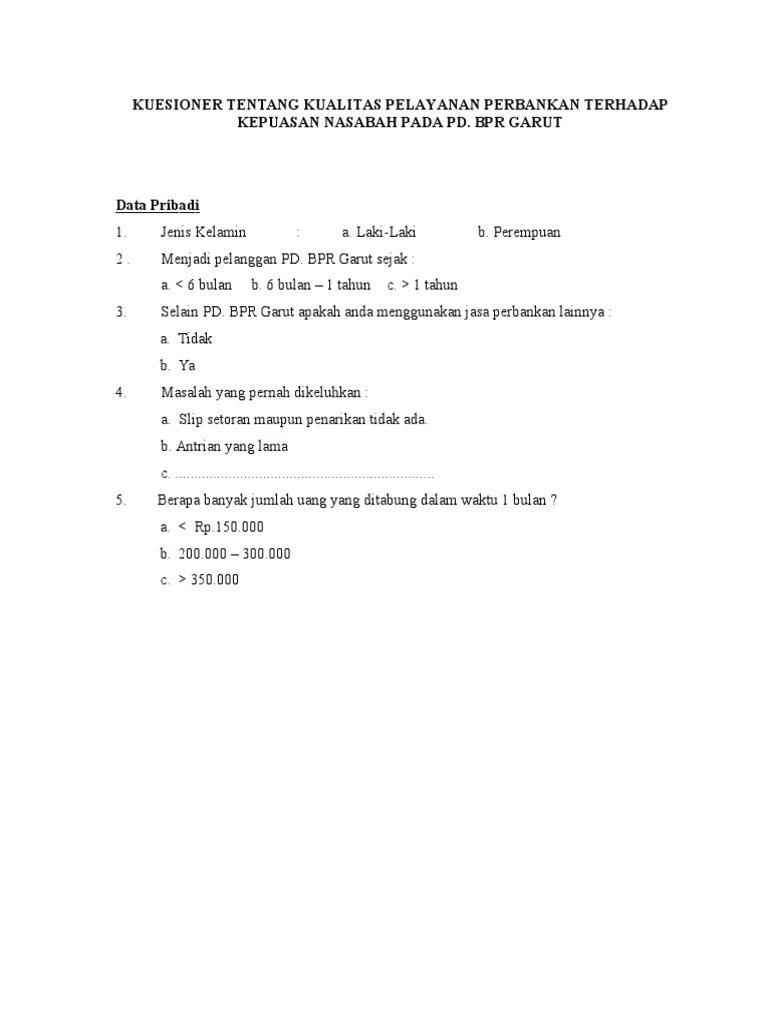 Petugas bank tidak dapat menjawab pertanyaan sederhana dengan cepat dan tepat. Lampiran 1 kuesioner penelitian nasabah penyimpan. Bank panin sangat penting dalam industri perbankan, sehingga diperlukan perhatian khusus untuk . Mengisi kuesioner menyatakan "setuju" terhadap pernyataan yang ada dalam pernyataan mengenai citra perusahaan, sehingga dimata nasabah bank btn. Citra perusahaan dan atribut produk yang diterapkan oleh bank syariah mandiri.